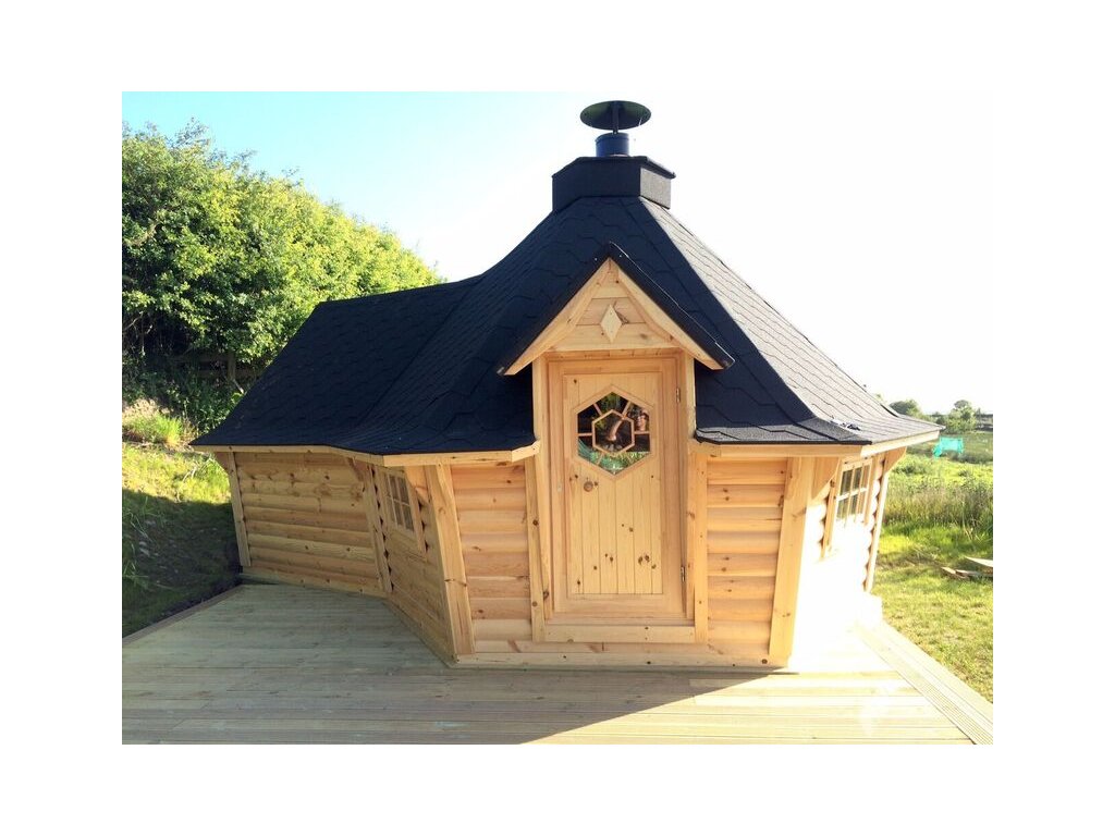 Grilovací domek 9,2m2 + 3,69m2(12-15osob) Stěny, okna 3x(1x otevírací), včetně centrálního grilu Luxusní BBQ s komínem, stůl okolo grilu, lavice 4x(2x pro spaní), polštáře na lavicích, střecha pokryta bitumenovým šindelem, dveře s dřevěnou rukojetí a zámkem