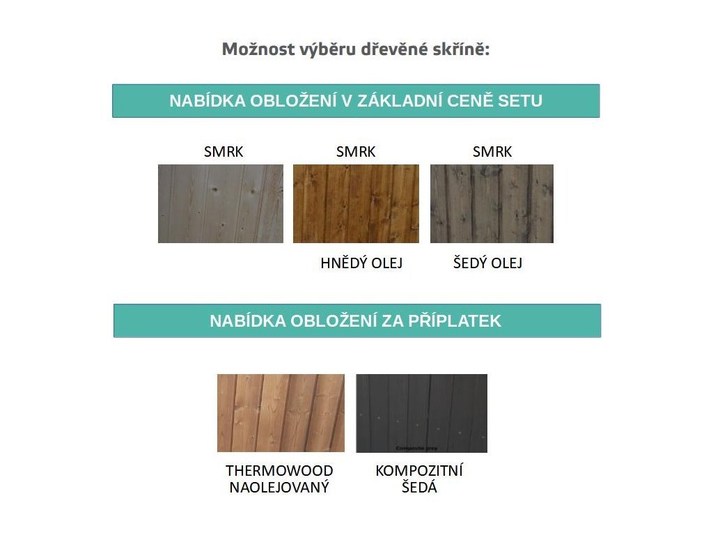 Koupací sety lze volit s venkovním obložením v různých barevných odstínech. V základní ceně setu je přírodní smrk, smrk v povrchové úpravě HNĚDÝ OLEJ nebo ŠEDÝ OLEJ. Za příplatek pak THERMOWOOD NAOLEJOVANÝ nebo KOMPOZITNÍ ŠEDÁ.