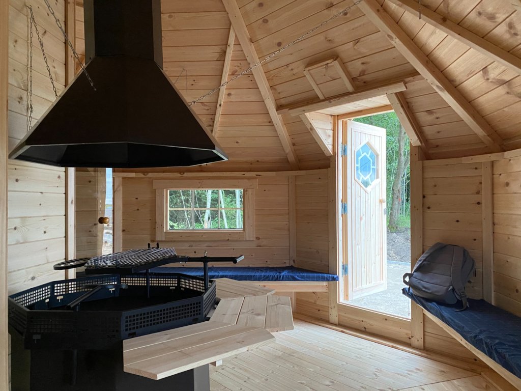 rovné stěny, střecha pokryta bitumenovým šindelem, dveře s dřevěnou rukojetí, dřevěné dveře s dvojitým sklem, včetně lavic, ohni odolné místo pro umístění kamen, okna z dvojitého skla, střecha sauny včetně izolace 50mm vlnou, střecha 18mm(borovice) zvenčí a 14mm (olše) zevnitř, tl.stěn 45mm, tl. podlahy 18mm, rozměr oken 512x442, rozměr dveří 780x1760mm, výška 3,8m